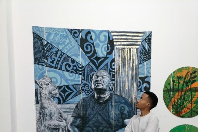 In this photo we can see Frans Thoka in front of some of his paintings/artworks. The first one on the extreme right of the screen or to the left of Frans Thoka is called Evil Eye