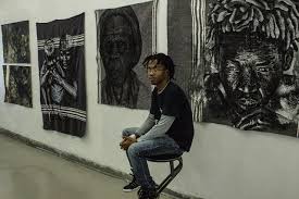 In this photo we can see Frans Thoka in front of some of his paintings/artworks. The first one on the extreme right of the screen or to the left of Frans Thoka is called Evil Eye